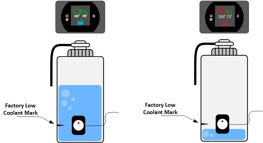 Low coolant level or loss of coolant is often the cause of engine overheating. Yet most vehicles do not have an indicator to monitor the coolant level or any alarm.