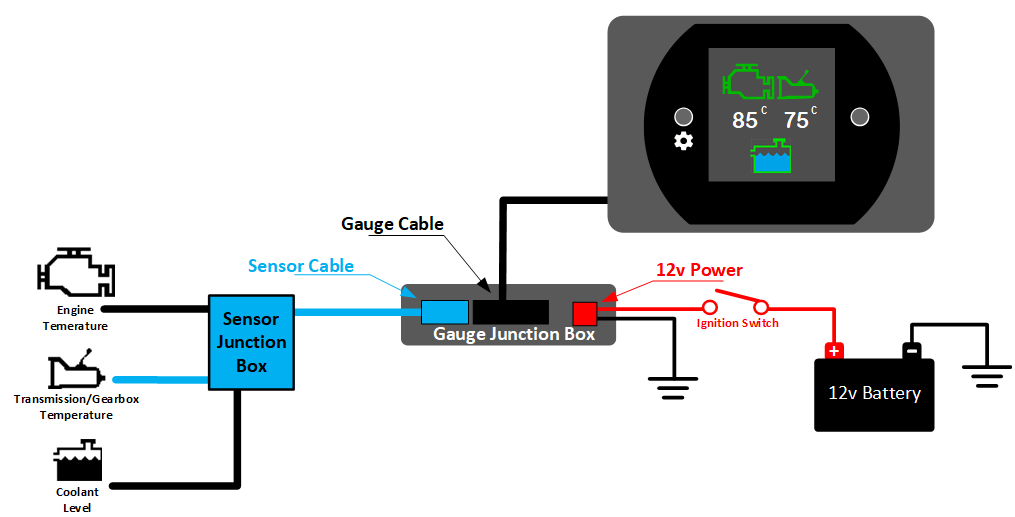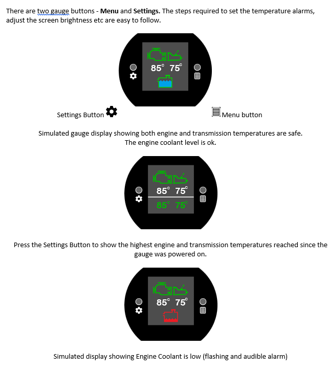The Engine and Transmission Temperature Gauge monitors and provides early warning of overheating or low coolant level with a visual and audible alarm you can set.