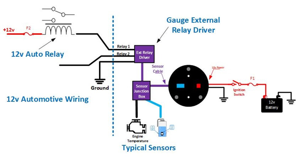 Relay 2 : Provides a current limited (200ma) solid state connection to ground if there is an AMBER warning or RED alarm on the gauge icon number 2. For example, Relay Driver 2 could be used to switch on a transmission cooling fan or alarm strobe light/siren via a 12v high current relay.